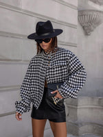 Make a bold statement with this houndstooth bomber jacket, where classic print meets modern streetwear. The oversized fit and dropped shoulders add a touch of relaxed edge, while the cropped cut keeps it chic and flattering. Featuring a timeless black-and-white houndstooth pattern, it’s perfect for elevating both casual and dressy looks.