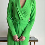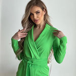 This Sienna Dress is a stunning piece that exudes elegance and sophistication. It features a vibrant hue that captures attention effortlessly. The dress is designed with a stylish asymmetrical belt that cinches the waist, highlighting the wearer’s figure gracefully. The long sleeves and deep V-neckline add a touch of femininity, making it a perfect choice for various occasions.