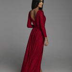 Dazzle in elegance with our Long Sleeve Maxi dress. The long sleeves are expertly tailored for comfort and grace, while a unique open back design adds an element of surprise and allure. Fitted with a zipper in the back and crafted from stretch fabric, this dress ensures a perfect fit. The mesh in the cleavage area completes the look, adding a touch of sensuality and sophistication. Whether you're attending a formal event or simply want to feel confident and beautiful, this dress is sure to make an impression.