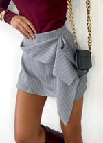 Chic and modern, this pinstripe draped mini skirt is designed to elevate your wardrobe with effortless sophistication. The structured draped detail on the front adds a touch of elegance, while the tailored fit flatters the silhouette. Perfect for pairing with blouses, bodysuits, or knits, this versatile piece transitions seamlessly from office-ready looks to evening outings.