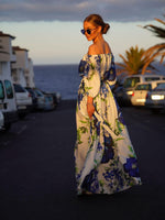 But the beauty goes beyond the print. The off-shoulder design delicately frames your face and shoulders, adding a touch of alluring femininity. The flowing maxi length cascades down your figure with graceful elegance, inviting you to twirl into the summer breeze.