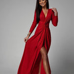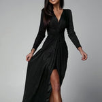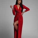 This Twist Maxi Dress is a showstopper that masterfully blends elegance with playful allure. Its luxurious fabric shimmers with subtle sparkles, casting a mesmerizing light wherever you go. Featuring a deep V-neckline and long sleeves, the dress strikes a perfect balance between bold exposure and sophisticated coverage. The contemporary twist detail at the waist cinches and flatters, seamlessly connecting to a fluid skirt that cascades down to the floor. But wait, there's more! An enticing slit graces one side of the skirt, offering a captivating glimpse of your legs as you move. Long sleeves, a front split, an underneath mini, and a dramatic tail end – this dress has it all, ensuring you make a lasting impression at any event.