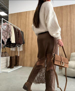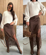 Elevate your wardrobe with this stunning satin lace overlay skirt — a perfect fusion of sophistication and femininity. Designed with a sleek satin base and an asymmetrical lace hem, this piece exudes elegance with a modern edge. The soft, flowing fabric creates a graceful silhouette, while the intricate lace adds a romantic touch. Pair it with a cozy knit sweater for a chic daytime look or a fitted blouse for evening sophistication.