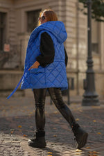 Add a bold touch to your fall and winter looks with this blue quilted hooded vest. Designed with diamond stitching, a belted waist, and a cozy hood, it brings both warmth and street-chic style. Its sleeveless design makes it easy to layer over sweaters, hoodies, or fitted tops, while the tie belt cinches the waist for a flattering silhouette. Perfect for city strolls or casual outings.