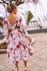 Embrace the beauty of spring and summer with this charming floral dress. Featuring a deep V-back design that exudes elegance, the dress is lined for added coverage and comfort. A zipper in the back ensures a perfect fit, while a cinched waist accentuates your curves. The long, flowy sleeves and lightweight fabric create a breezy and stylish silhouette that is perfect for any occasion. Whether you're attending an afternoon garden party or an evening soiree, this dress will make you feel confident and beautiful.