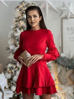 - Long Sleeve Decorative Sleeve Ostrich Feather Cuff Pleated Bottom Mini Dress