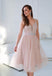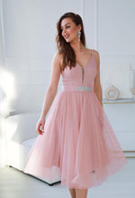 This beautifully crafted midi dress blends timeless elegance with modern femininity. Designed with a flattering V-neckline and delicate straps, the fitted bodice flows into a soft, layered tulle skirt that creates graceful movement with every step. A subtle embellished detail at the waist adds a touch of sparkle and defines the silhouette, making this dress perfect for weddings, formal events, and special celebrations.