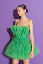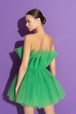 Dazzle any occasion with this vibrant, lined Green Tulle Mini dress. The strapless design allows you to flaunt your shoulders, while the fitted waist accentuates your silhouette. The voluminous tulle adds a playful touch, making it perfect for cocktail parties, proms, or any other special occasion.