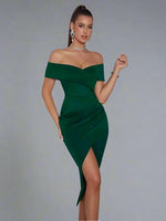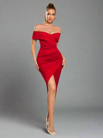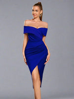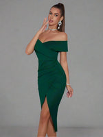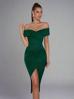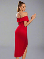 Fall in love with this Off The Shoulder Body Con Bandage Midi Dress! Its elegant off the shoulder design adds a touch of sophistication while the body con and bandage features accentuate your curves. Perfect for any occasion, this dress will make you feel confident and beautiful.