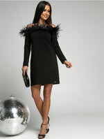- Off The Shoulder Feather Long Sleeve Mini Dress