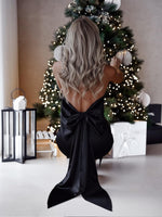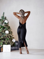 Satin Body Con Halter Bow Tie Midi Maxi Dress