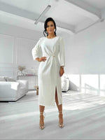 Indulge in sophistication with our Elegant Midi Dress. Designed with long sleeves, a ruching waist, and a subtle split in the leg, this dress exudes elegance. Its midi length makes it perfect for any business, communion, or baptism occasion. Elevate your wardrobe with this exclusive piece.