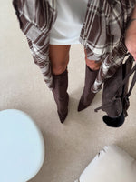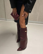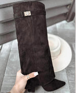 Make a confident statement in these high knee pointed boots — the perfect blend of sophistication and bold design. Featuring a sleek, structured silhouette with a pointed toe and a subtle block heel, these boots elongate the leg for a refined, feminine look. The soft suede and premium leather options add luxurious texture, while a gold-tone accent on the upper edge provides a modern, high-end touch. Perfect for pairing with skirts, dresses, or tailored trousers, they transition effortlessly from day to night with timeless appeal.