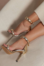 Step into the spotlight with these statement-making metallic heels. Featuring sculptural padded straps and a sleek stiletto heel, these shoes are the epitome of glam sophistication. The ankle wrap detail ensures a secure fit while adding a bold architectural element to your look. Perfect for evening events, celebrations, or when your outfit needs that luxurious finishing touch.