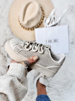 Step up your everyday style with these beige crystal-embellished sneakers – a perfect balance of comfort and glamour. Designed with sparkling rhinestone details across the upper, these sneakers add a chic touch to any casual outfit while keeping you comfortable all day. The neutral tone makes them versatile enough to pair with denim, dresses, or tailored looks.