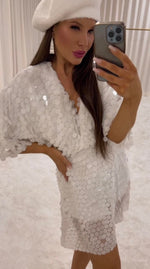 Command attention in the Shimmer Sequin Jumpsuit, a show-stopping piece that redefines party style. Designed with oversized white sequins from top to hem, this jumpsuit reflects light beautifully for an ultra-lux look. The flowy silhouette, soft V-neckline, and sheer underlay give it a dreamy, ethereal quality while keeping things modern and fun.