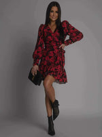 Transform your wardrobe with the Ruffle Bottom Dress. This wrap around dress features a playful ruffle bottom and a roached shoulder for a chic and comfortable fit. The cuffed sleeve with 3 gold buttons adds a touch of elegance to this versatile piece. Elevate your style effortlessly.