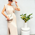 Step into effortless elegance with this Pleated Beige Maxi Dress – a chic, breathable piece that blends timeless sophistication with modern minimalism. Crafted with soft pleats and a relaxed silhouette, it features a side slit and adjustable waist tie for a flattering, one-size fit. Whether you're dressing for brunch, vacation, or a city stroll, this dress is your go-to for refined, comfortable style.