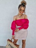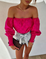 Turn heads in this vibrant off-the-shoulder fuchsia top, featuring subtle polka dot texture for a playful yet chic appeal. The smocked cuffs add a touch of femininity while ensuring a comfortable fit, and the voluminous sleeves give it that modern, romantic silhouette. Perfect for pairing with high-waisted shorts, skirts, or tailored pants for an effortlessly stylish look.
