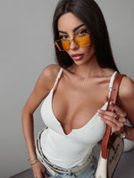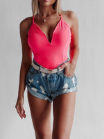 Sultry meets sporty in this ultra-flattering ribbed bodysuit. Featuring a plunging deep-V neckline and thin adjustable straps, this piece is made to contour and complement. Whether you're heading out, layering under a blazer, or styling it with your favorite denim, this bodysuit brings effortless confidence in every color.