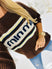 - Sporty chic – bold logo-style knit design