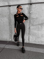 Make a bold yet elegant statement in this sculpted long-sleeve top featuring strategically placed chest cut-outs and a sleek body-hugging fit. Designed to turn heads while offering comfort and stretch, this piece blends daring design with minimalist sophistication. The sleeve features a subtle script-style logo print for added flair.