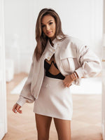 Sculpted from a premium wool-blend fabric and fully lined for comfort, this cropped bomber jacket and mini skirt set redefines modern tailoring. The jacket features a high stand collar, oversized flap pocket, and soft structural volume in the sleeves — all cinched at the waist for a flattering, cropped finish. Paired with a matching mini skirt, the look is sleek, powerful, and unapologetically feminine.