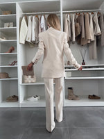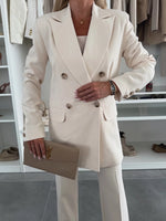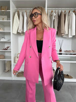 Elevate your tailoring with this powerfully feminine suit set. Featuring a long, double-breasted blazer and wide-leg pants, this timeless duo delivers sophistication with modern elegance. Available in soft pink and classic ivory, it’s perfect for commanding the room — whether you're heading to a meeting or a special event.