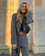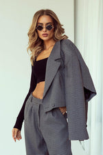 Upgrade your wardrobe with our luxurious Cropped Houndstooth Suit. This elegant suit features a cropped blazer and pleated wide leg pants in a sophisticated houndstooth pattern. Elevate your style with this exclusive piece that combines art and fashion seamlessly.