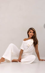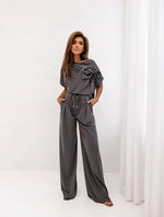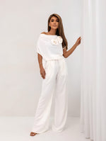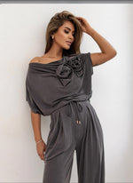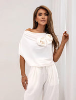 Refined elegance meets modern comfort in this wide-leg matching set, designed for an effortlessly sophisticated look. The draped boat neckline is adorned with a delicate 3D floral applique, adding a touch of romance and femininity. The loose-fit top flows gracefully into high-waisted drawstring pants, offering both style and ease for day-to-night wear. Available in timeless White and sleek Charcoal, this set is a versatile wardrobe staple for special occasions or elevated everyday style.