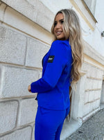 Step into sleek sophistication with this modern tailored two-piece suit, blending structure with comfort. Designed with a soft, stretchy fabric, it features a fitted blazer with a drawstring waist for a flattering adjustable fit and slim-cut trousers for a contemporary silhouette. Subtle stitching details and a small logo patch on the sleeve add a touch of sporty elegance.
