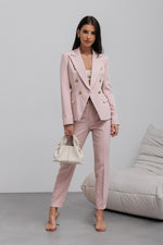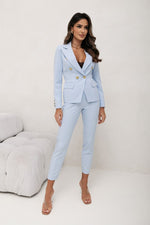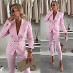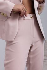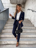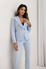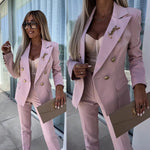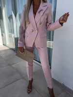 Step into timeless elegance with this beautifully tailored two-piece suit, crafted to make a sophisticated statement. The double-breasted blazer features a sleek, structured design with gold button accents, flap pockets, and a feminine, contoured fit. The coordinating slim-fit trousers elongate the legs while maintaining comfort and movement.