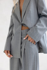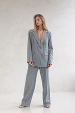 Redefine effortless sophistication with this pinstripe oversized suit, designed for a powerful yet relaxed silhouette. The blazer features a slightly boxy cut with structured shoulders, notched lapels, and a two-button closure for a timeless tailored finish. The matching wide-leg trousers add fluidity and balance, creating an elongating effect that complements the relaxed fit.