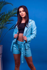 Command attention with this standout Vegan Leather Matching Set in a vibrant electric blue hue. Featuring a long belted biker-style jacket and high-waisted shorts with decorative gold buttons, this set is equal parts edgy and playful. Crafted from smooth, flexible vegan leather, it offers structure with a touch of stretch—making it perfect for both casual glam and elevated off-duty looks.