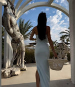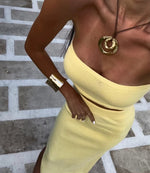 Chic and sun-kissed ready, this two-piece ribbed knit set features a strapless bandeau top paired with a high-waisted maxi skirt that hugs the body and finishes with a side slit for added movement. The soft knit texture offers comfort with polish, perfect for beach getaways, summer parties, or resort strolls.