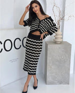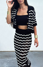 Make a bold yet timeless statement with this chic black and white chevron knit matching set. The cropped button-front cardigan pairs effortlessly with the high-waisted, midi-length skirt for a coordinated, elegant look. Crafted from a soft, breathable knit with a touch of stretch, this set offers comfort without compromising on style. Perfect for both casual and dressier occasions, it’s a versatile addition to your wardrobe.