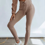 Redefine your off-duty uniform with these ultra-flattering High-Waisted Ribbed Leggings — the perfect fusion of comfort, structure, and subtle style. Designed with a wide waistband, adjustable front lace-up detail, and body-contouring ribbed fabric, these leggings hug your curves while offering breathable flexibility.