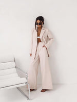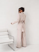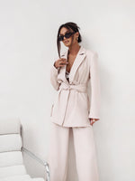 Where structure meets softness. This light beige tailored suit set features a flattering belted blazer and wide-leg trousers crafted in a fluid, mid-weight fabric. Designed to cinch you in and flow with you, this set effortlessly balances sharp tailoring with refined femininity. The wrap-around belt adds a modern twist to classic suiting, while the full-length trousers elongate the silhouette.