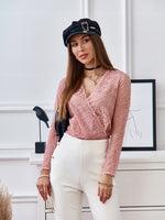 Elevate your elegance with this romantic lace bodysuit, designed with a flattering wrap front and delicate scalloped edges. The long sleeves and full lace texture offer graceful coverage while maintaining a sultry, feminine allure. Ideal for pairing with high-waisted trousers, skirts, or tailored layers, this bodysuit brings timeless sophistication to any outfit.
