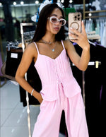 Step into soft sophistication with this Pink Button & Bow Tie Detail Set, designed to blend comfort with effortless charm. The sleeveless top features a delicate button-down front, subtle pleating, and a waist-defining bow tie that cinches you in all the right places. The matching high-waisted straight-leg pants elongate your silhouette for a flattering, feminine look that transitions from brunch to evening with ease.
