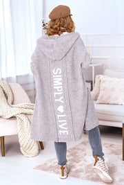 Bring comfort and positivity to your everyday wardrobe with the Simply Live hooded cardigan. Crafted from a soft, cozy knit, this longline cardigan combines relaxed style with meaningful detail — featuring the uplifting “SIMPLY ♥ LIVE” text on the back. The oversized fit, large front pockets, and warm hood make it a perfect piece for lounging at home or layering on casual outings. Stylish yet effortlessly comfortable, it’s a feel-good essential for every season.