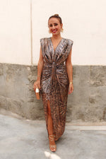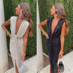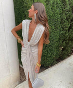 Elevate your wardrobe with our Waterfall Sleeveless Knot dress! The stunning midi dress features a sleek sleeveless design and a flattering V neckline. The standout detail? A gorgeous waterfall knot front that adds a touch of chic to any occasion. Perfect for showing off your legs with a leg split feature.